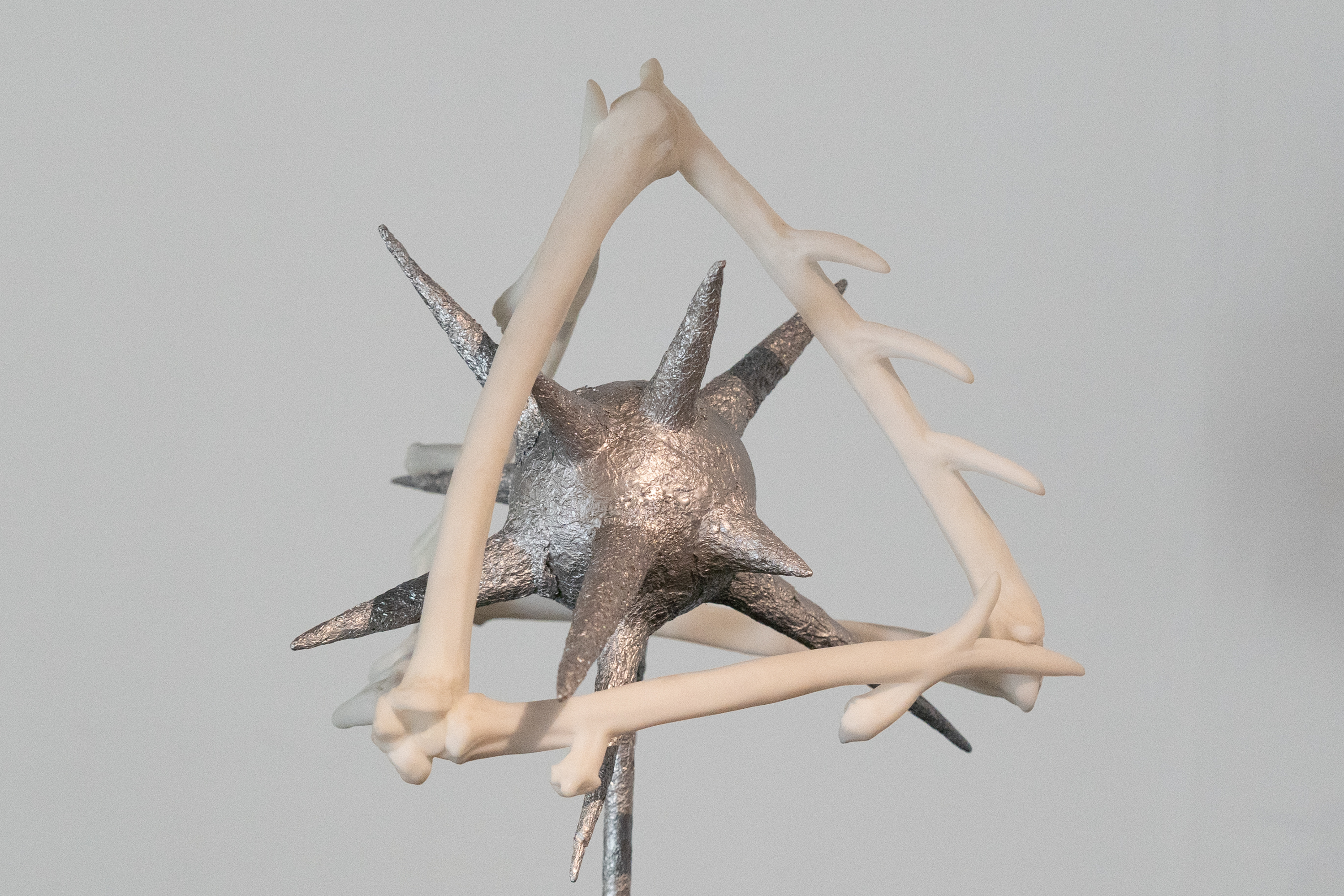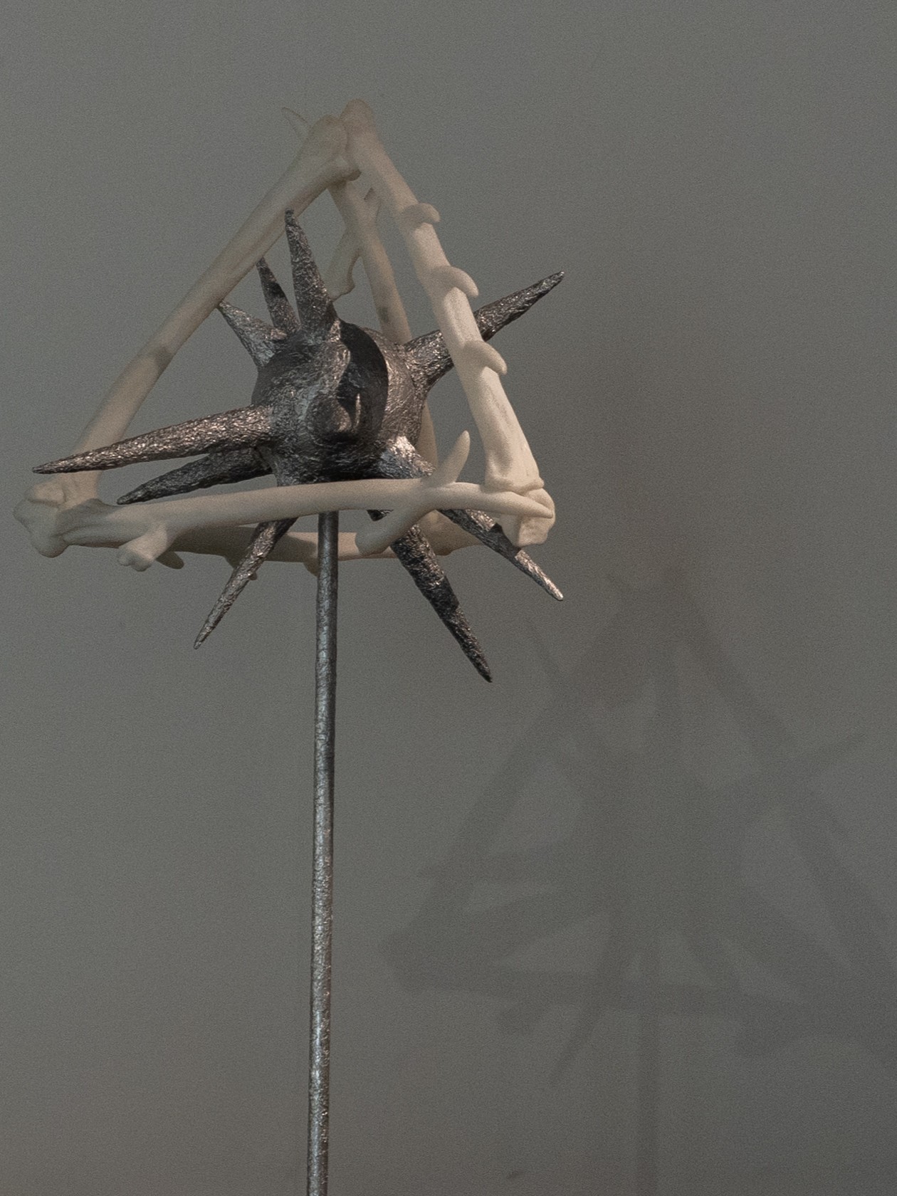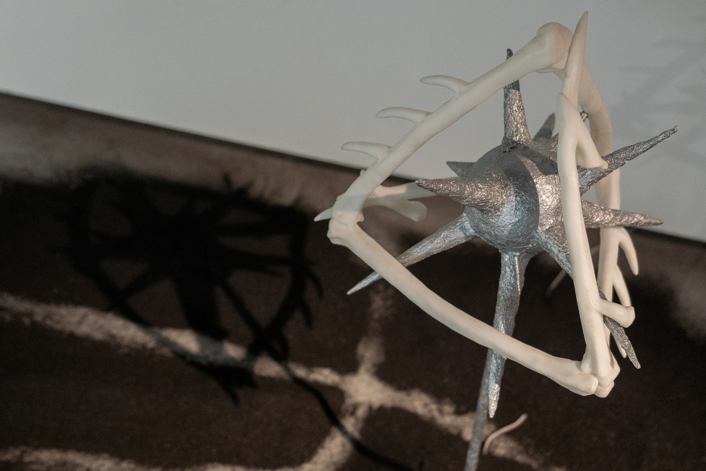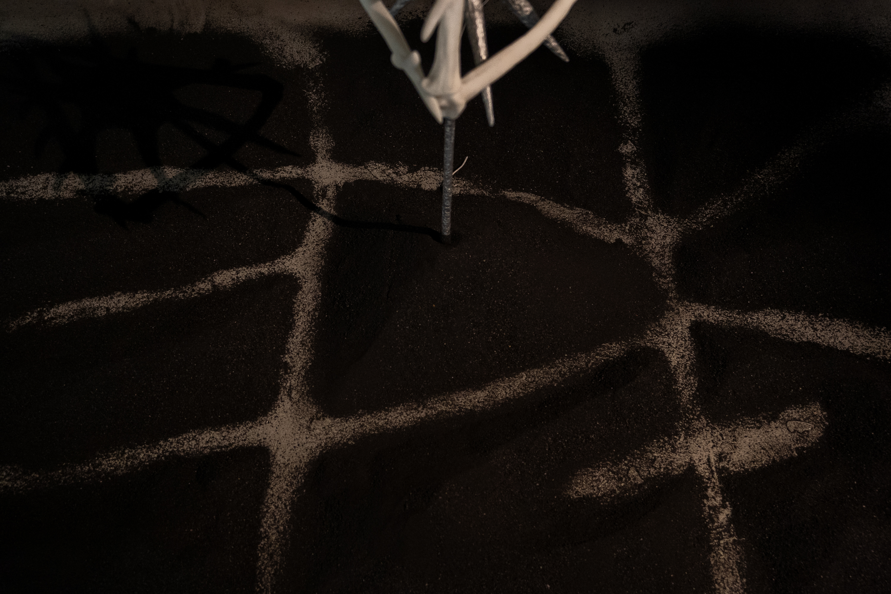 作品概念是一系列由中文書寫系統和骸骨輪廓結合而成的繪畫開始。從歷史文明與文化烙印之中探索,把紙本上被封印著的幾何架構,分拆又重建,延伸或互相接觸,鍥合而成一個立體體系。裝置在碳粉的堆砌之上緩慢自轉,與物料的質感和遺下的顏色都隱約透露出漸變的循環,被動地邀請著觀者進入被受控制的環境下,感受物理空間凝結在正當爆發的一刻。這個分明的距離感都實驗著每種線條依附在三維空間中所擔當的角色:虛或實,都會再次映現,黑白與正負,都在這一點開始新的方向或繼續。