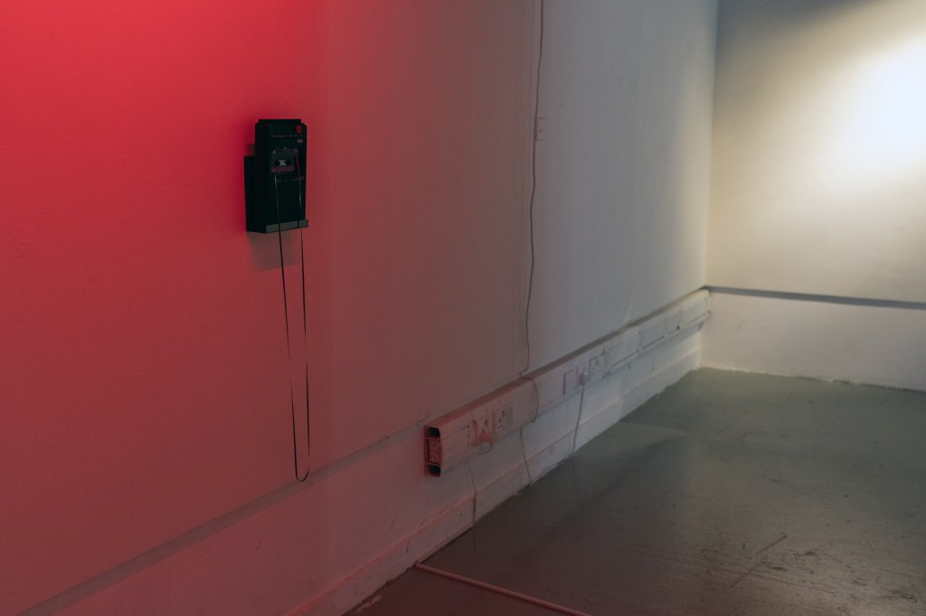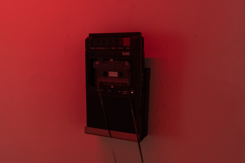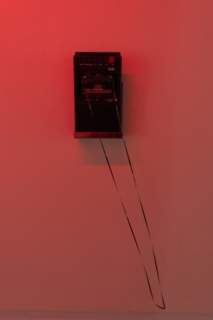 Cassette tape loops, filter paper, LED tube, recorded sounds (1 minute and 1 minute 30 seconds; continuous play)