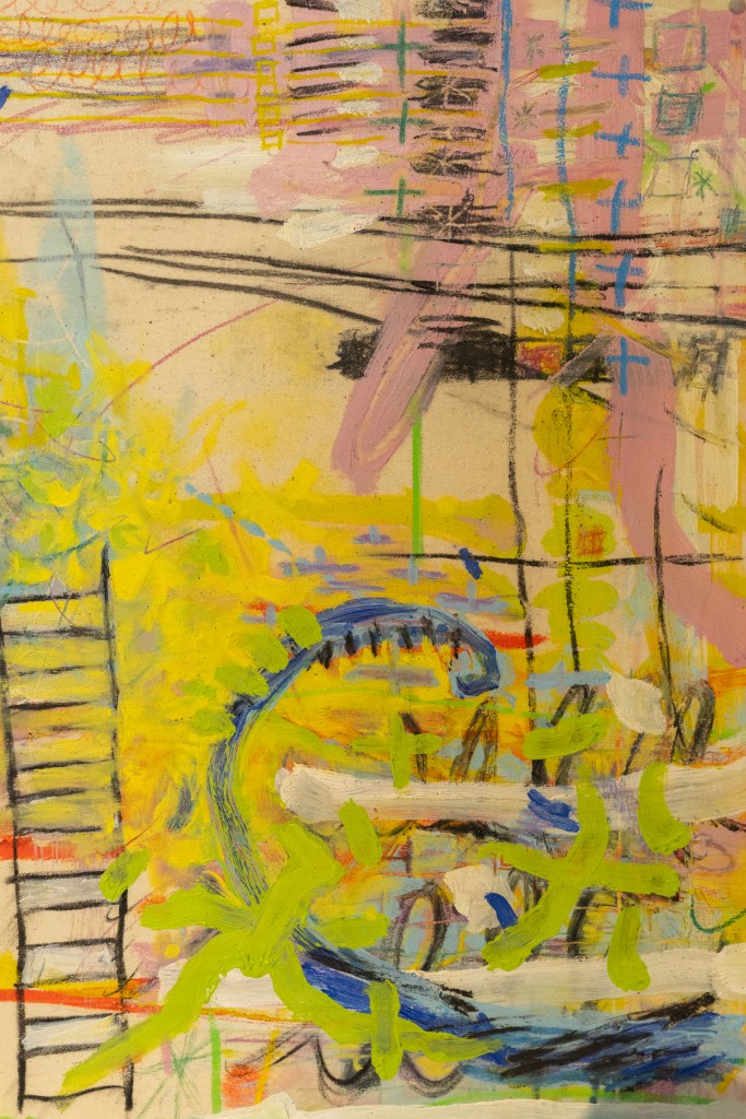 These two paintings are layers detached from narrative objectives, woven into the colors through points, lines, and planes. The abstract brushstrokes are born from intuition, where one is asked to immerse deeply in the environment to make intuitive decisions, thus capturing the essence of sounds radiating in all directions away. Drifting sounds await to be contained, with the process of drawing almost mirroring a reverent prayer: only through patient waiting in the unreserved exposure, until achieving inner balance through attentive external listening, that the last thoughts be recalled. The self acts as a vessel where there’s a back-and-forth on the roles of creators and observers, diminishing recognition of forms and shapes until a shape is formed. Careful consideration to untangle the complexities, to select and order, to question, and to embrace – all of these subtle methods sculpt the spatiality of sound.