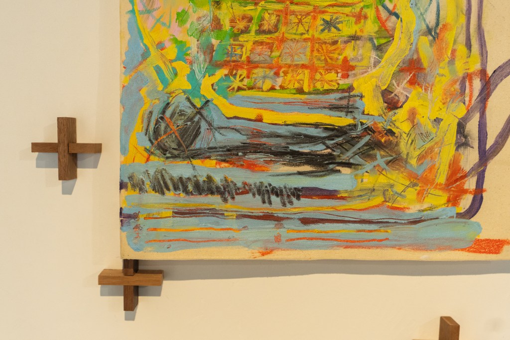 木條從畫布背後掙脫,分裂,重組成交叉的形狀。虛線般排列,試探又計算;又正如虛線,延伸卻有所保留;交叉的十字撒網般分散在隱藏的點上,保持卻又超越本應有的秩序。
